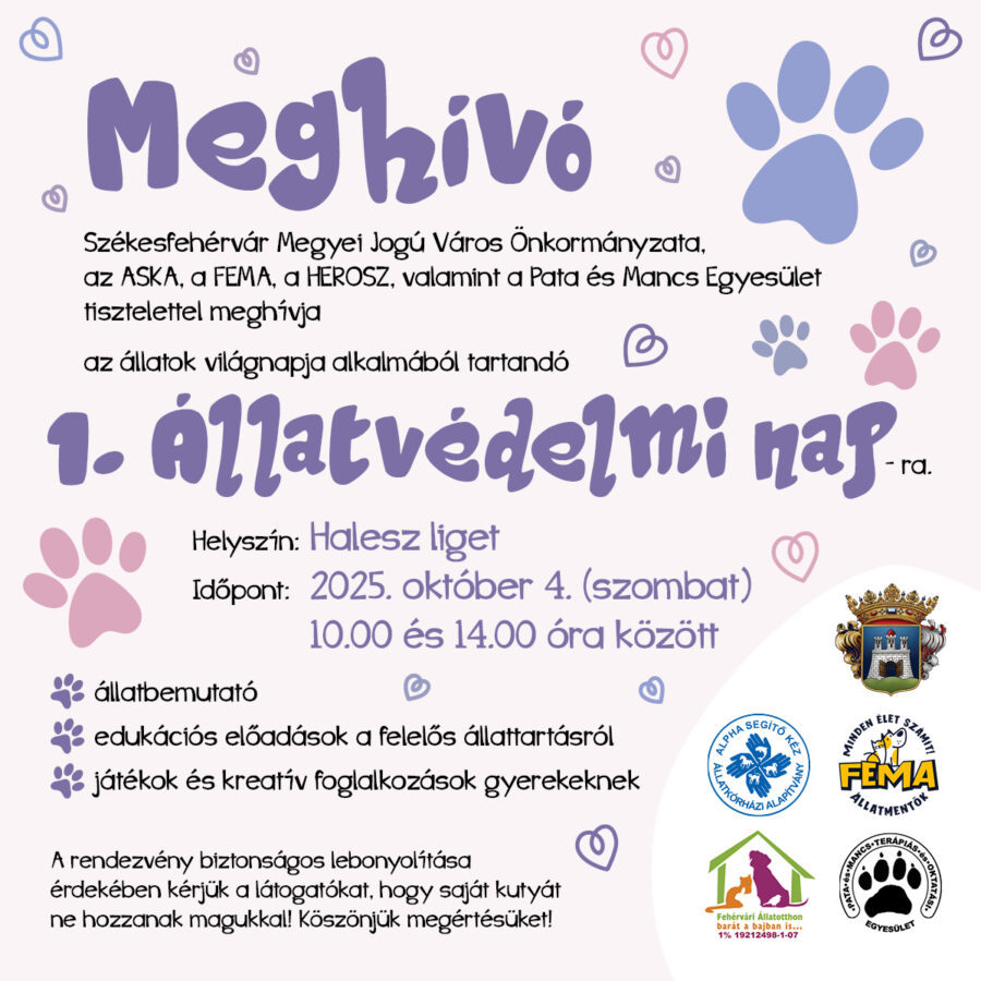 Az október 4-én 10.00 órakor kezdődő Állatvédelmi Napon képviselteti magát a HEROSZ Fehérvári Állatotthona, a FEMA Állatmentők, az ASKA kutyamenhely, a Pata és Mancs Egyesület, valamint az Ebügyek Kutyás Érdekvédelmi Egyesület.