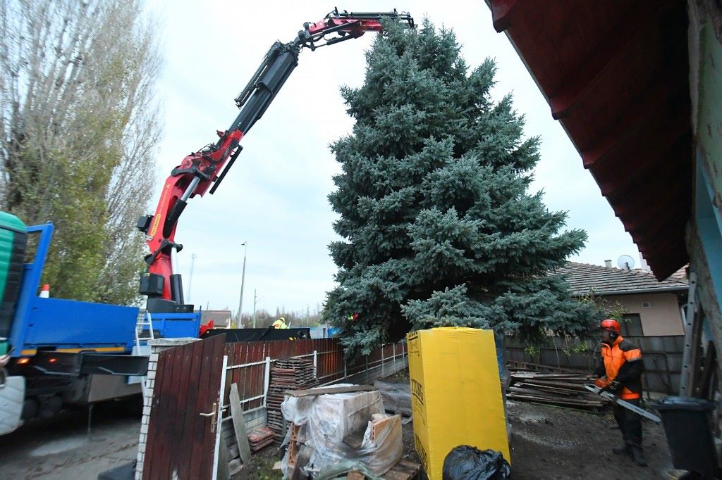 Teherautó, daruskocsi és városgondnoksági autók érkeztek hétfőn reggel fél 7 tájban a Mártírok útja egyik házához, ahol Gőbölös Gábor, a fa felajánlója éppen azon tanakodott, miként emelik majd ki a szakemberek a kis előkertből a terebélyes fenyőt. A felajánlást tevő székesfehérvári család még a nyár elején vásárolta meg a Mártírok úti, régi házacskát, s mint a tulajdonos mondta, komoly felújításba kezdtek. Ezt megelőzően a ház előtti kertet, a fenyőfa környékét is kitakarították, ekkor merült fel, hogy sajnos a fának „mennie kell”, mert a házba be kell vezetni a gázt, valamint a víz- és a szennyvízvezetéket is cserélni kell.