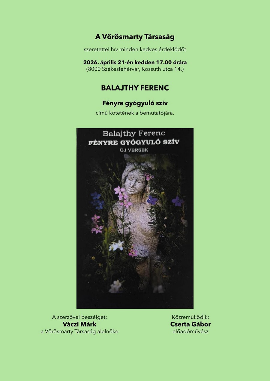 Április 21-én kedden, 17 órai kezdettel mutatják be a Vörösmarty Társaság székházában Balajthy Ferenc „Fényre gyógyuló szív” című új verseskötetét. A szerzővel Váczi Márk, a Vörösmarty Társaság alelnöke beszélget, a rendezvényen Cserta Balázs előadóművész közreműködik.