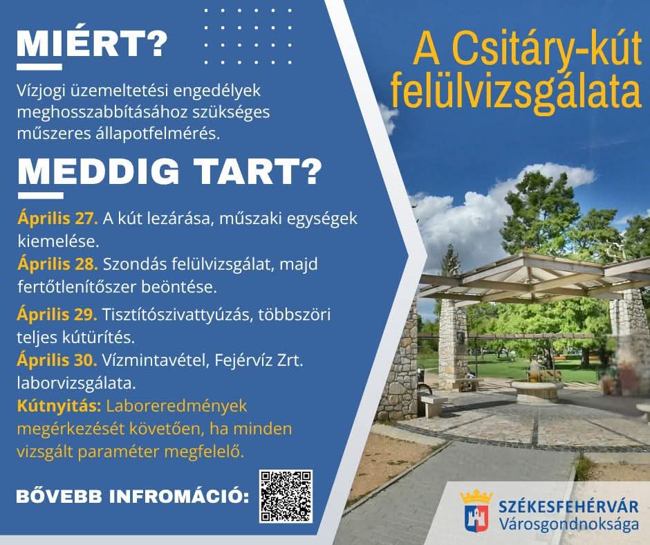 A Városgondnokság 2025-ben indította el a kezelésében lévő városi kutak vízjogi üzemeltetési engedélyeihez szükséges műszeres állapotfelmérést, amelynek utolsó lépéseként a Csitáry-kút felülvizsgálata is megtörténik áprilisában. A vizsgálat ideje alatt a kút nem üzemel majd.