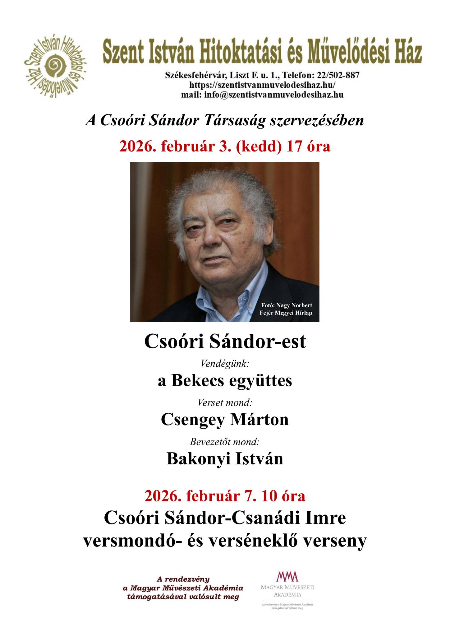 Több különleges programra is készülnek február első napjaiban a Szent István Hitoktatási és Művelődési Házban: 3-án Csoóri Sándor-estet, 7-én Csoóri-Csanádi versmondó és verséneklő versenyt rendeznek, míg 6-án Kapolcsi Lajcsi Bácsik címmel, fából faragott szobrokból nyílik kiállítás.