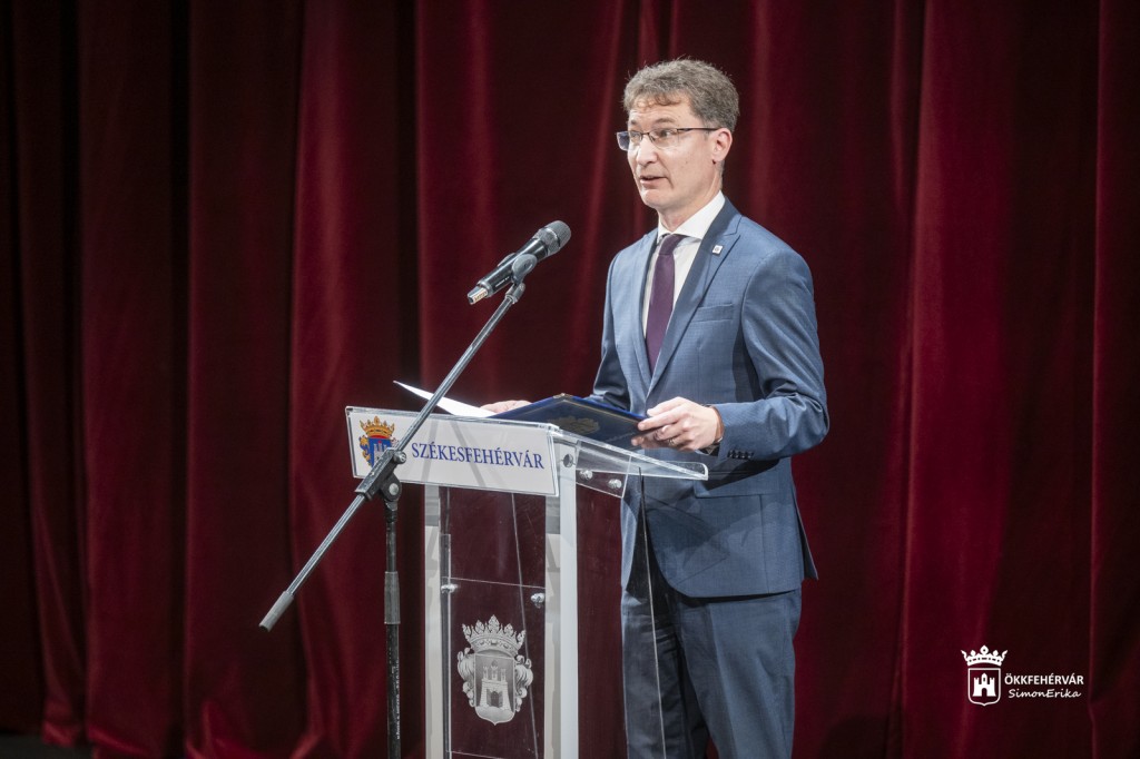 Az ünnepség idén a Vörösmarty Színházban folytatódott, ahol elsőként Székesfehérvár polgármestere szólt: „A történelem kevés nemzetet és nemzedéket állít akkora próbatétel elé, hogy egy gonosz birodalommal, vagy egy végletekig hazug ideológiával szemben szinte a semmiből kelljen egyéni és nemzeti szabadságát újra és újra kivívnia.” – kezdte beszédét dr. Cser-Palkovics András. Székesfehérvár polgármestere hangsúlyozta, hazánk és városunk elmúlt fél évezredében számos próbatétel volt, ám ezek közül az 1956-os forradalom kiemelkedik: időben Ők állnak hozzánk legközelebb és élesen láthatjuk, hogy nem pusztán külső hódítókkal, elnyomókkal, hanem hatalomvágyó, gátlástalan hazai kiszolgálóikkal is meg kellett küzdeniük.