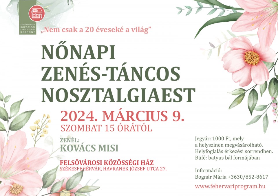 A „Nem csak a 20 éveseké a világ” Nyugdíjasklub és a Székesfehérvári Közösségi és Kulturális Központ nőnapi zenés-táncos nosztalgiaestet rendez 2024. március 9-én, szombaton 15 órától a Felsővárosi Közösségi Házban.