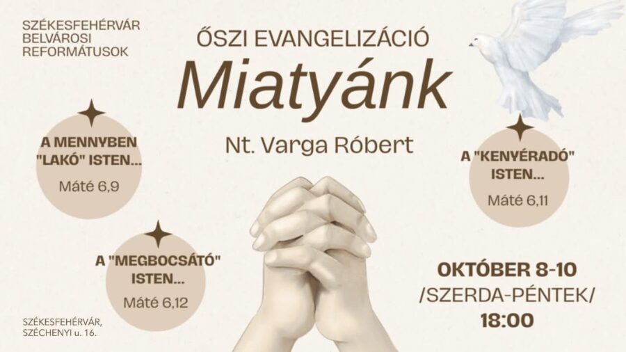 Miatyánk címmel szerveznek három napos előadás-sorozatot a Belvárosi Református Egyházközségben október 8-10-ig, szerdától péntekig, naponta 18 órai kezdettel a Széchenyi utca 16. szám alatt. A meghívott előadó Varga Róbert nyugalmazott református lelkipásztor.