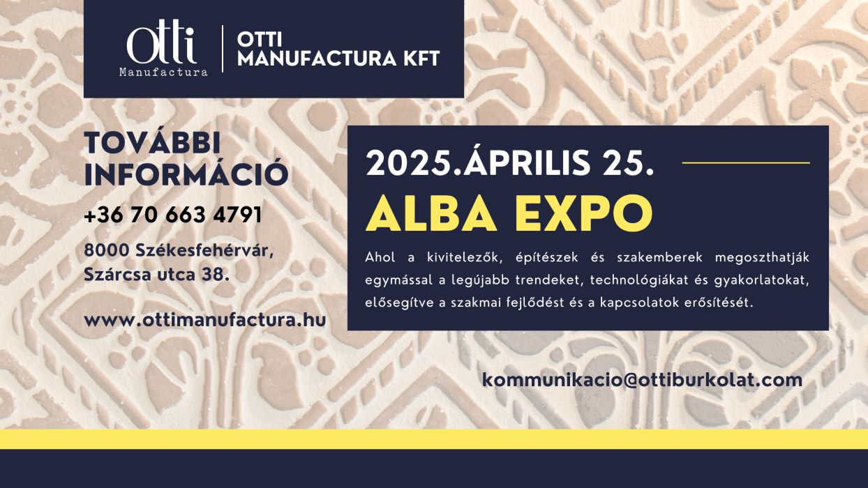 Építőipari kiállítást szervez április 25-én, pénteken Székesfehérváron az Otti Manufactura. Az Alba Expon a pályaválasztás előtt álló és a szakoktatásban tanuló diákokat is várják, akiknek a workshopokon lehetősége nyílik arra is, hogy tapasztalatot és motivációt szerezzenek a szakma jeles képviselőitől, a kiállító gyártóktól, forgalmazóktól.