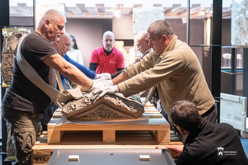 Mostanra beérett a munka, hosszas diplomáciai tárgyalások, egyeztetések és szervezés után csütörtökön délelőtt ugyanis megérkezett Székesfehérvárra a magyarság és azon belül Fehérvár számára is kiemelt értéket jelentő sírfedél, amelyet hamarosan a Nemzeti Emlékhely Koronázó Bazilika Látogatóközpontban csodálhatnak meg az érdeklődők. A légkondicionált kamionról lekerült kőfaragványt precíz mozdulatokkal, minden lépést átgondolva juttatták el a Látogatóközpontban kijelölt helyére, majd a kicsomagolás után az 500 kilós tumbát végül négy ember együttesen emelte a posztamensre.