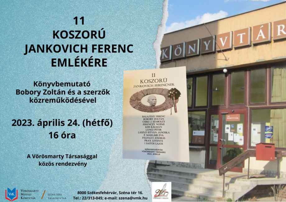 A Vörösmarty Társaság minden érdeklődőt szeretettel vár április 24-én, hétfőn 16 órától a Vörösmarty Mihály Könyvtár Széna téri Tagkönyvtárába, amelynek falán a székesfehérvári születésű Jankovich Ferenc emléktáblája is található.