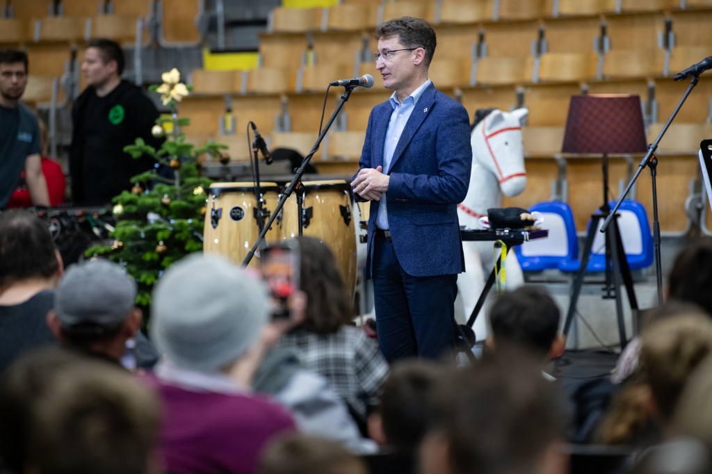 Köszöntőjében Vargha Tamás miniszterhelyettes, országgyűlési képviselő hangsúlyozta, advent idején sokat beszélünk a várakozás öröméről, emellett a szeretetről és az összefogás fontosságáról is kell, hiszen a székesfehérvári emberek közös adományát hozták ma el. A Szeretet Karácsony jegyében nyolc szervezet összefogásának eredményeképp adhatják át ezeket az ajándékokat. „Kívánok jó szórakozást a műsorhoz, és mindenkinek boldog, áldott karácsonyt.” – zárta szavait.