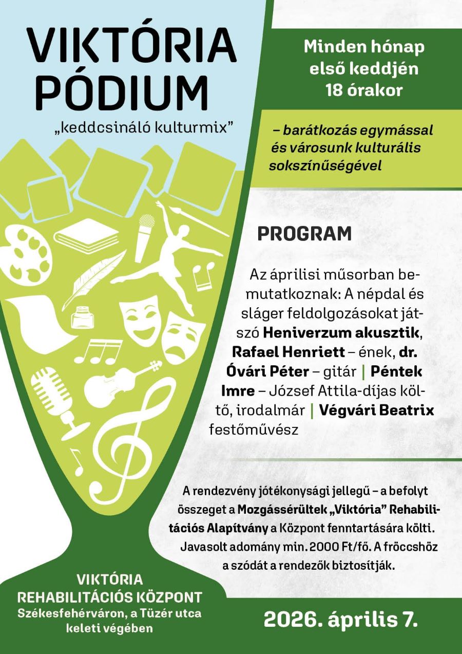 A Heniverzum akusztik koncertjével indul a tavaszi Viktória Pódium. Rafael Henriett és dr. Óvári Péter népdal- és slágerfeldolgozásokkal hangolja jó kedvre a közönséget. A Viktória Rehabilitációs Központ nagytermében április 7-én, kedden 18 órakor kezdődő eseményen Péntek Imre, József Attila-díjas költő irodalmár és Végvári Beatrix festőművész mesél magáról, a művészetről, az alkotói folyamatokról és az alkotás útjáról.