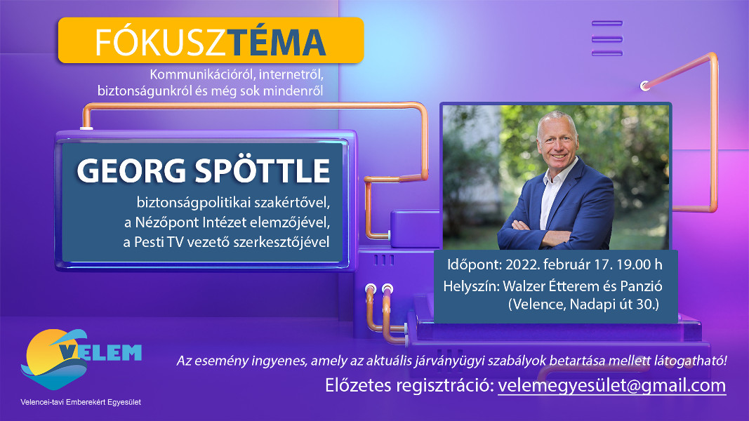 Georg Spöttle csütörtökön 17.00 órakor Pátkán a Református Egyházközség programjának keretében (helyszín: Pátka, Kossuth u. 58.), majd 19.00 órától a közeli Velencén (Walzer Étterem, Nadapi út 30.) a VELEM Egyesület meghívására tart interaktív előadást – egyebek mellett – a migrációs válság aktuális kérdéseiről, a határvédelemről és az orosz-ukrán feszültségről.