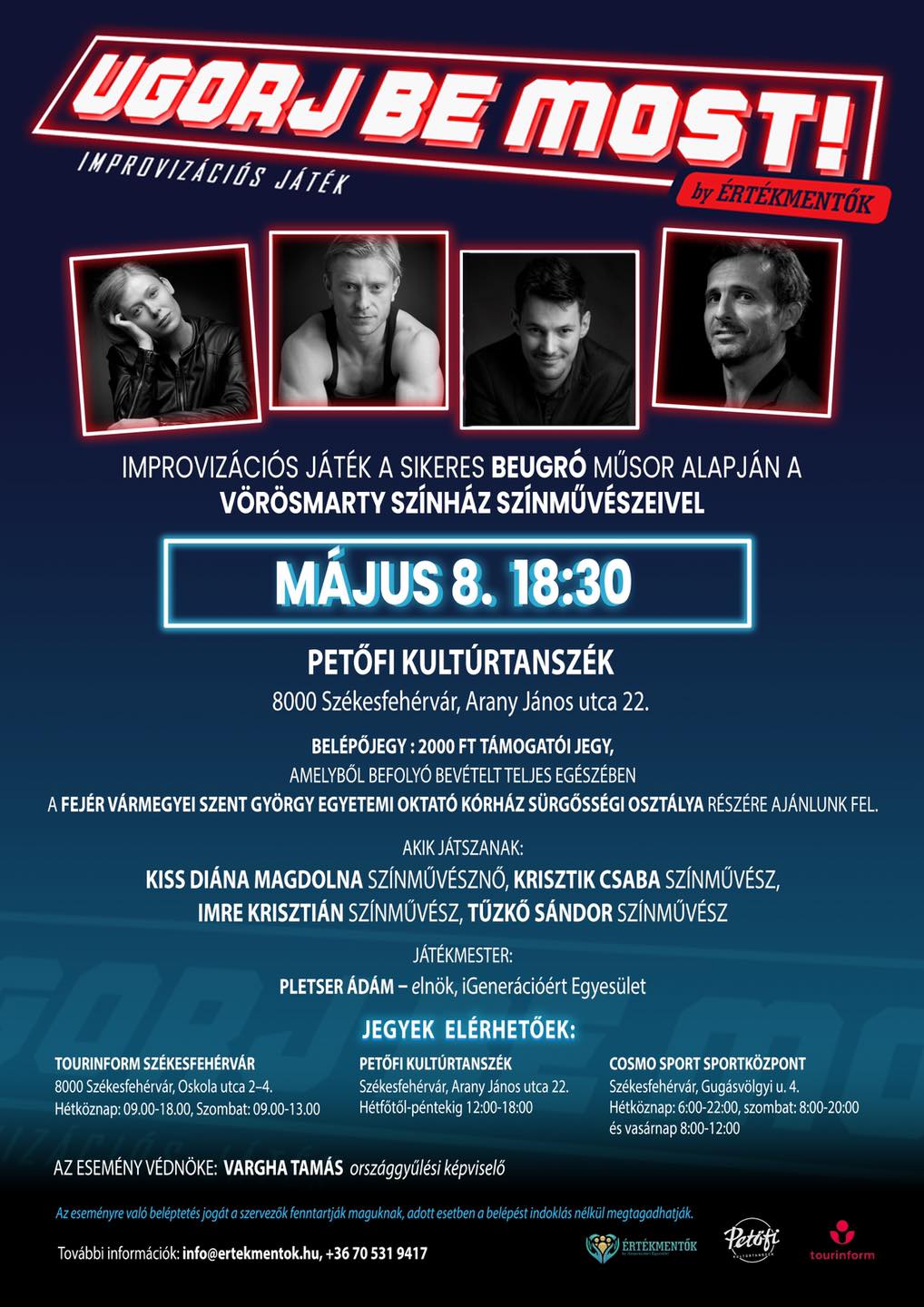Újra jótékony céllal rendezi meg az Ugorj be most! improvizációs játékokból álló estet az Értékmentők. A Petőfi Kultúrtanszéken május 8-án, hétfőn 18.30 órakor kezdődő előadásra 2000 forintért lehet támogatói jegyet váltani. A teljes bevételt a Fejér Vármegyei Szent György Egyetemi Oktató Kórház Sürgősségi Osztályának ajánlják fel a szervezők.
