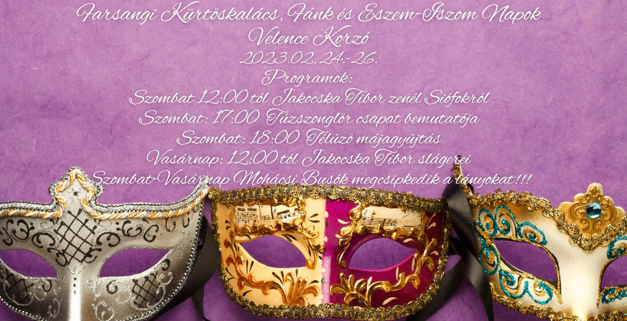 Egy igen sikeres, sokezer érdeklődőt vonzó Kocsonya és Disznótoros Napokkal vette kezdetét az idei rendezvények sora a Velence Korzón, ahol a következő hétvégén már a farsang és a télűzés áll a középpontban gasztronómiai alapokon, némi jótékonysággal fűszerezve: február 24. és 26. között kerül sor a Farsangi Kürtőskalács, Fánk és Eszem-iszom Napokra.