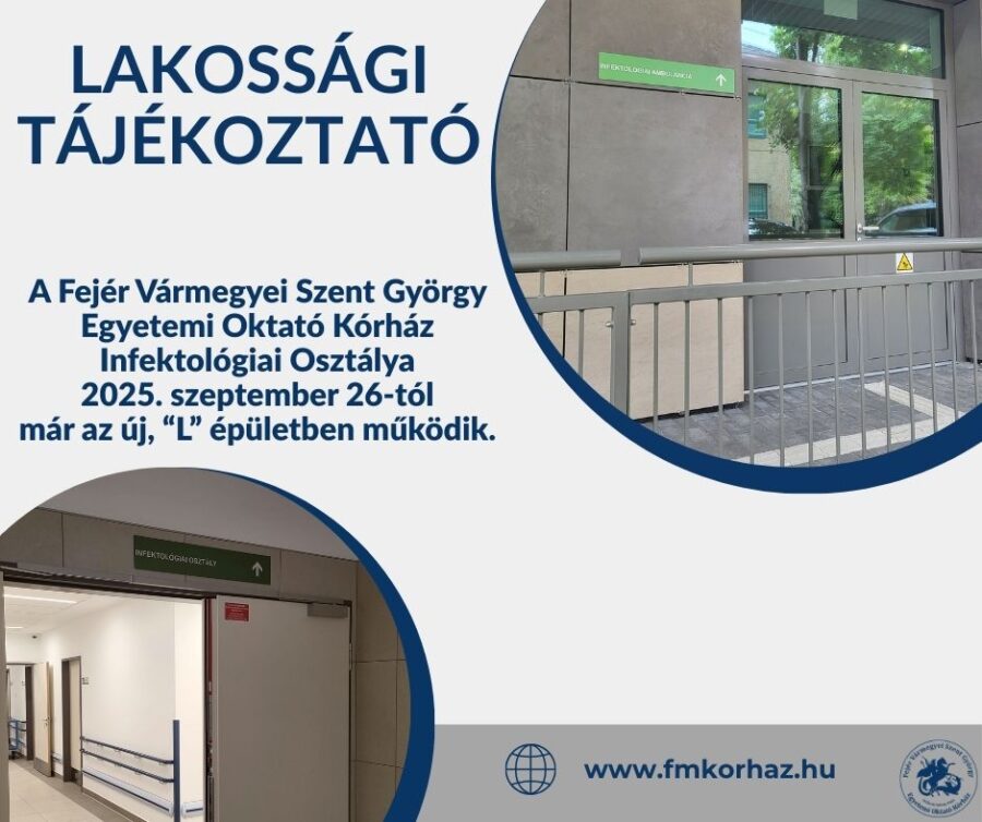 A Fejér Vármegyei Szent György Egyetemi Oktató Kórház Facebook oldalára kitett bejegyzés szerint az Infektológiai Osztálya 2025. szeptember 26-tól már az új, „L” épület első szintjén működik; az Infektológiai Ambulancia és a Nemzetközi Oltópont pedig 2025. szeptember 29-től várja az új helyszínen a betegeket. Mint írják, a költözés megkezdődött, de ez nem befolyásolja az osztály működését, a sürgős eseteket ebben az időszakban is ellátják a kórház munkatársai. Fontos tudni, hogy az osztály a költözés ideje alatt, azaz 2025. szeptember 26. (péntek) 12:00 óráig az alábbi telefonszámon érhető el: +3622 535-500/1120-as mellék.