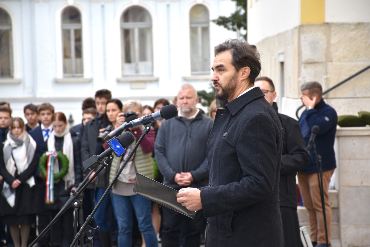 Az imádságos megemlékezésen a közös himnuszéneklést és a Szent Imre iskola 12. osztályos tanulója, Szűcs Boglárka versmondását (Nagy Gáspár Október végi tiszta lángok című versét olvasta fel) követően a Vörösmarty Színház igazgatója, Dolhai Attila tolmácsolta ünnepi, emlékező gondolatatait, tisztelettel és hálával fejet hajtva azok előtt, akik életüket adták a szabadságért, a demokráciáért és az igazságért. „Az októberi napok története örök tanúságtétel arról, hogy az emberi méltóság és a szabadság iránti vágy elpusztíthatatlan!” – fogalmazott, majd Bibó István szavait idézte: „…A szabadság ott kezdődik, ahol megszűnik a félelem…”