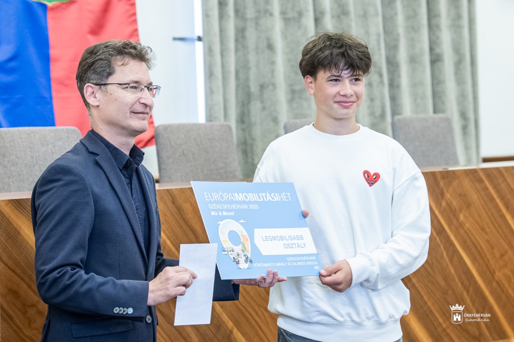 Az idei évben immár huszonnegyedik alkalommal rendezték meg szeptember 16. és 22. között Európa legnagyobb közlekedési és környezetvédelmi kampányát, az egyre népszerűbb Európai Mobilitási Hetet. Ennek keretében Székesfehérváron ismét versenyt hirdettek a „Legmobilisabb osztály” cím elnyeréséért, melyre összesen hét általános iskolás csapat nevezett. A vetélkedőn a tavalyi első helyezett megvédte címét, a Vörösmarty Mihály Általános Iskola 8/B osztálya lett a győztes. A kétszeres bajnokokat dr. Cser-Palkovics András polgármester fogadta a Városházán, aki gratulált a nagyszerű eredményhez, sok sikert kívánt a tanévhez és a közelgő felvételihez, majd átadta a nyereményeket: egy emléklapot, a Damniczki Cukrászda által felajánlott csokoládétortát és a Decathlon áruház ajándékát, egy 100 ezer forintos utalványt.