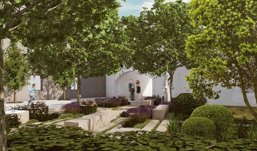 A Koronázó tér és a Nemzeti Emlékhely melletti sétány burkolatcseréje mellett szépen halad a Városháza Díszudvarának felújítása is, ami mindig is szervesen kapcsolódott a Városház térhez és a Fő utcához. Megnövelt zöldfelülettel, csobogóval, utcabútorokkal és térvilágítással rendelkező, mediterrán hangulatú kis tér lesz jövő tavaszra.