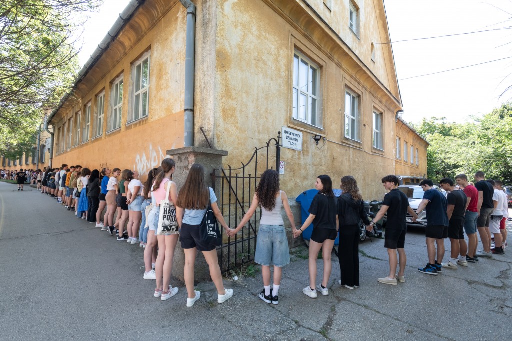 A tanulók és a pedagógusok ma egy, a Diákönkormányzat által szervezett, különleges kezdeményezéssel köszöntek el a megszokott, szeretett, ódon falaktól. Egymás kezét fogva átölelték az iskolát, majd az udvaron egy körülbelül egyórás búcsúbulit is tartottak.
