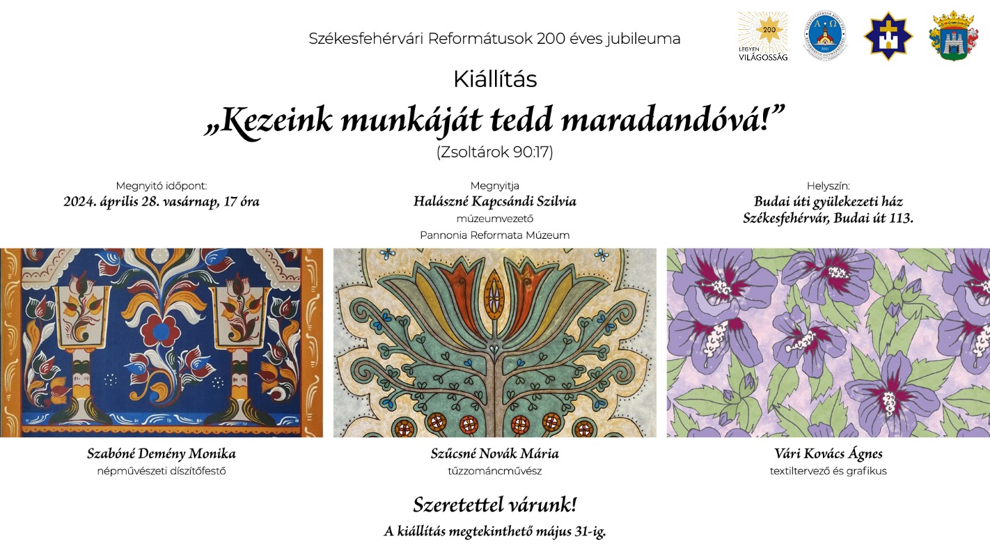 Idén ünnepli fennállásának 200. évfordulóját a Székesfehérvári Református Gyülekezet. A jubileumi év programsorozatában előadások, találkozók, konferenciák és koncertek mellett kiállítások is szerepelenek. A legfrissebb április 28-án nyílik. A „Kezeink munkáját tedd maradandóvá!” című tárlaton Szabóné Demény Monika népi bútorfestő, Szűcsné Novák Mária tűzzománcművész, Vári Kovács Ágnes textiltervező és grafikus alkotásai láthatóak. A tárlatot Halászné Kapcsándi Szilvia, a Pannonia Reformata Múzeum vezetője nyitja meg vasárnap 17 órakor a Budai úti Református Gyülekezeti Házban.