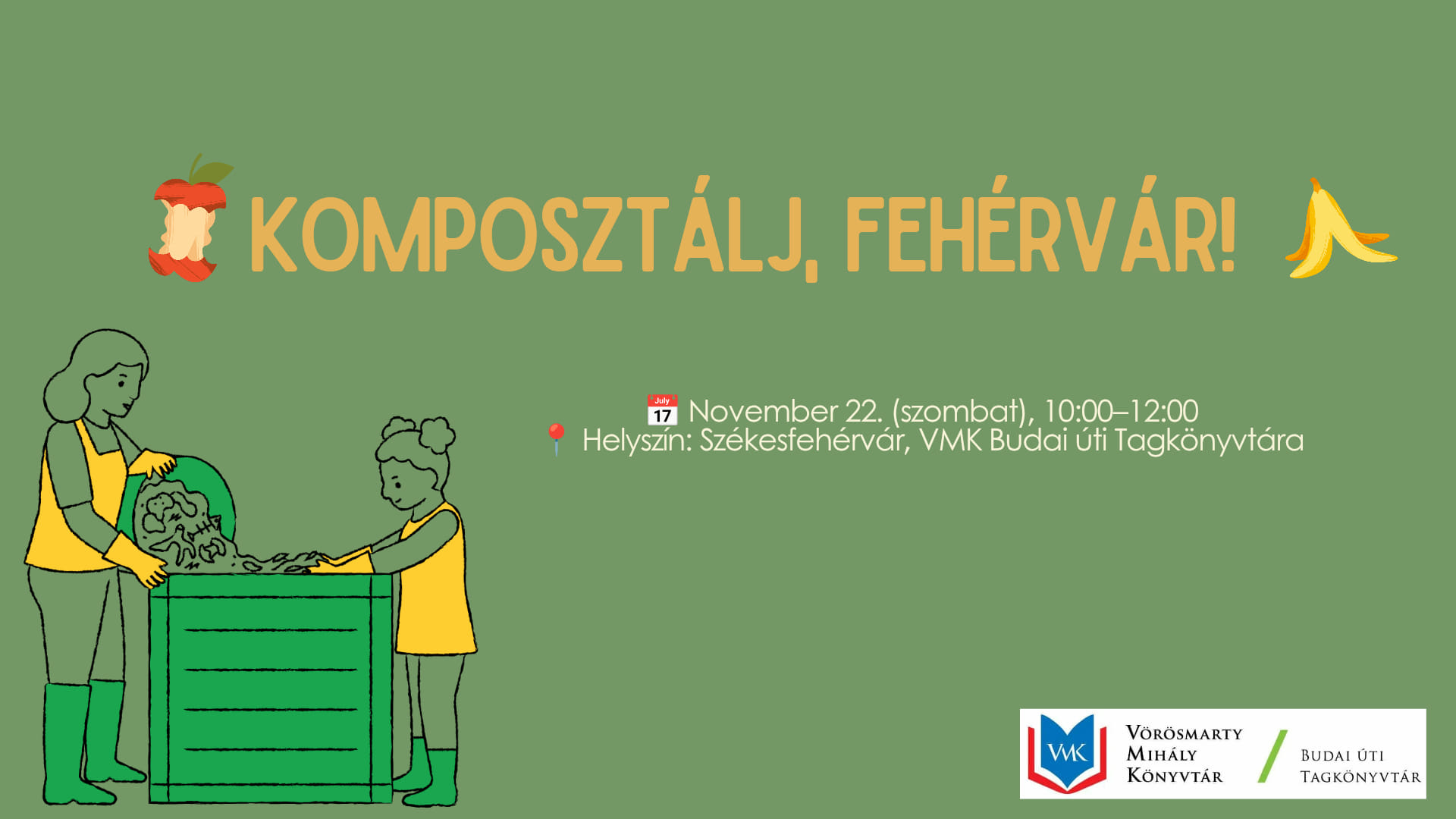 November 22-i kezdettel négy alkalomból álló, ingyenes környezetei nevelési programsorozat indul a Vörösmarty Mihály Könyvtár Budai úti Tagkönyvtárában, melynek során a résztvevők a komposztálás világába kalandozhatnak szakértők és zöldaktivisták segítségével. A program során elsajátítható, hogyan lehet a konyhai és a kerti hulladékot értékes tápanyaggá formálni, ami által csökkenthetjük a háztartási hulladékunk mennyiségét.