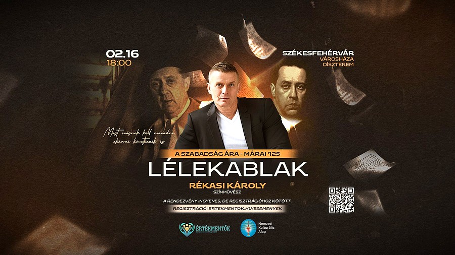 Székesfehérváron láthatja a közönség Rékasi Károly színművész egyfelvonásos Márai Sándor-estjét „Lélekablak – a szabadság ára” címmel. A monodrámát a Városháza Dísztermében mutatják be február 16-án, hétfőn 18 órai kezdettel.