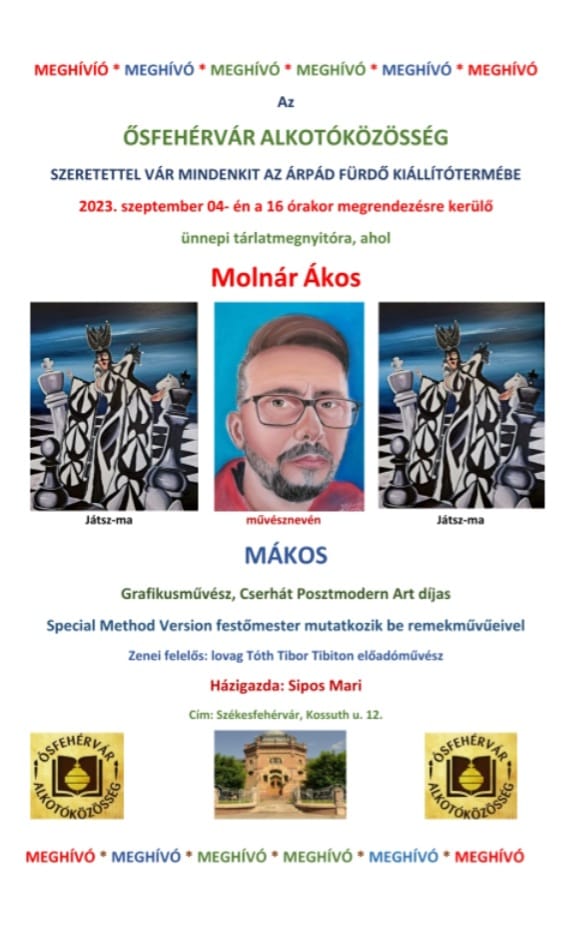 Az Ősfehérvár Alkotóközösség tagjai írók, költők, zenészek és versmondók, kézműves és kreatív alkotók. A közösség most Molnár Ákos Cserhát Posztmodern Art díjas grafikus, Special Method Version festőmester képeiből állított össze tárlatot, melyet szeptember 4-én, hétfőn 16.00 órától nyitnak meg az Árpád Fürdőben. A kiállítást Sipos Mária, az Ősfehérvár Alkotóközösség alapítója, Art-díjas költő nyitja meg. Közreműködik Tóth Tibor Tibiton.