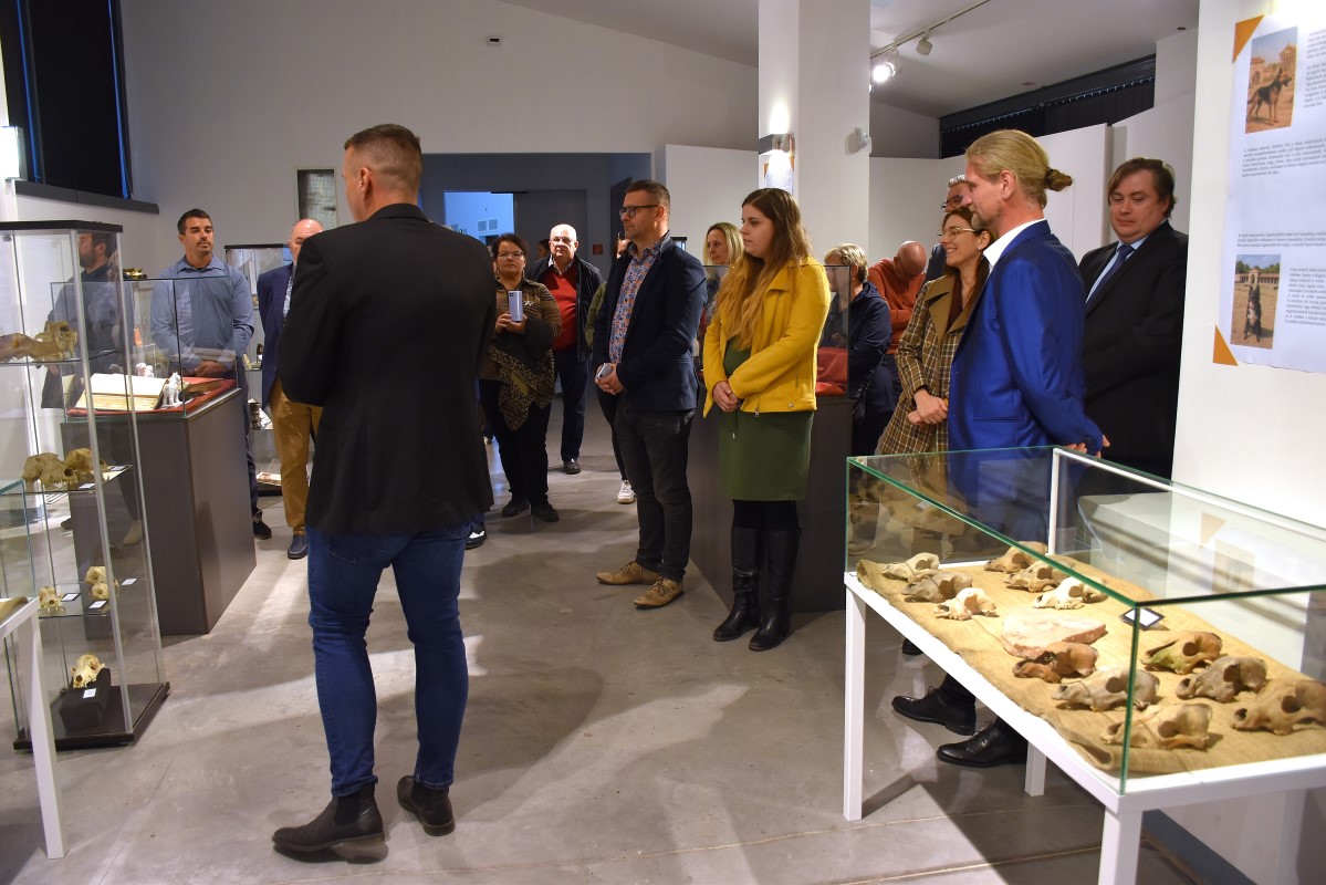 A megjelenteket Makó János kutyatörténeti kutató és Fekete Fruzsina régész kalauzolta a közös térben látható kiállításon. Az „Ősi nyomokon – Róma árnyékában, magyar földön” című kiállításon az érdeklődő láthat például olyan gorsiumi téglákat, amelyekre – még száradásuk közben – ráléptek a többezer éve élt ebek, így lábnyomukat megőrizték az örökkévalónak. Itt debütál az az 1936-ban előkerült, II. századi kutyaszobor is, amelyet sokáig nagymacskaként azonosítottak, ám amit Fekete Fruzsina és Makó János az állat jegyei és a megkurtított farok alapján „canis pugnax”-ként, azaz római harci kutyaként definiált. Mint megtudhattuk, a Nemzetközi Pumi Egyesület gondozásában lévő kutyatörténeti gyűjtemény számos különlegességgel büszkélkedhet, s egykoron a világ legnagyobbjának számított a maga mintegy 15 ezer tételével. Gorsiumban a Bökönyi Sándor által gyűjtött, római korból származó ebek koponyáitól kezdve a mai kutyák morfológiai jellegzetességeiig számos ismerettel bővíthetjük tudásunkat, láthatjuk a mára sajnos kihalt magyar szelindek koponyáját és a kutya rajzát, valamint a minden puli ősapjának számító kutya porcelán szobrát is. Megismerhetjük Raicsits Emil kinológus, azaz kutyaszakértő munkáját is, aki 1924-ben – a tenyésztésüket elindítva – megmentette a magyar kutyafajtákat. Sőt, ő volt az, aki a magyar fajták világhódító útját elindította: Európa összes királyi udvarába, az Egyesült Államokba is „exportált” számtalan kiváló négylábút, sőt XII. Pius pápa is két magyar vizslát vásárolt egykoron. Ehhez kapcsolódó fontos hír, hogy a new yorki Museum of The Dog elnevezésű intézményben 2027-ben a magyar kutyafajtákat ismerhetik meg a látogatók. A tárlaton a Szent István Király Múzeum régészeti gyűjteményének kutyákkal kapcsolatos tárgyai mellett a szóban forgó kutyatörténeti gyűjtemény számos darabja is New Yorkba érkezik majd a fehérvári múzeum szervezésében.