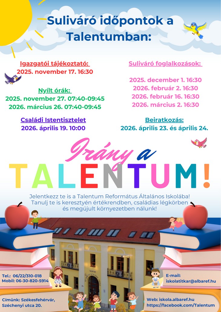 A következő hetekben, hónapokban változatos suliváró programokkal, igazgatói tájékoztatóval, nyílt órákkal és családi istentisztelettel várják a leendő első osztályos diákokat és szüleiket a Talentum Református Általános Iskolában. A beiratkozás időpontja 2026. április 23 és április 24.