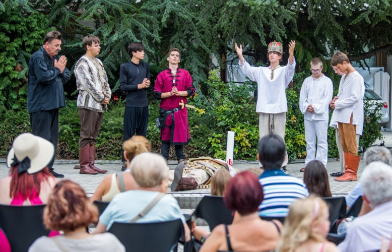 Estefán király legendáját elevenítette fel a Szabad Színház az Áron Nagy Lajos téren, ahol Adorján Viktornak a Hartvik püspök Szt. István-legendája nyomán írt darabját játszották. In medias res, a dolgok közepébe vágva kezdődött a középkori vígjátékok, a farce-ok stílusát, hangulatát megidéző előadás, pontosan a még Vajk névre hallgató gyermeket megtámadó torokgyík leküzdésétől indulva. A krónikás történetmondása a fiú neveltetésétől, Gizella asszonnyal kötött házasságától, Estefán lovaggá ’üttetésén’, Koppánynak az őrzőangyal általi ’legyőzettetésén’ át mesélte végig a legendát, amelyben a templomok, ’klastromok’ építtetését, az ország gyarapodását, a keresztény királlyá koronázást, majd Gellért püspök által feljegyzett, Szent Imre hercegnek megfogalmazott intelmeket is színpadra vitték.