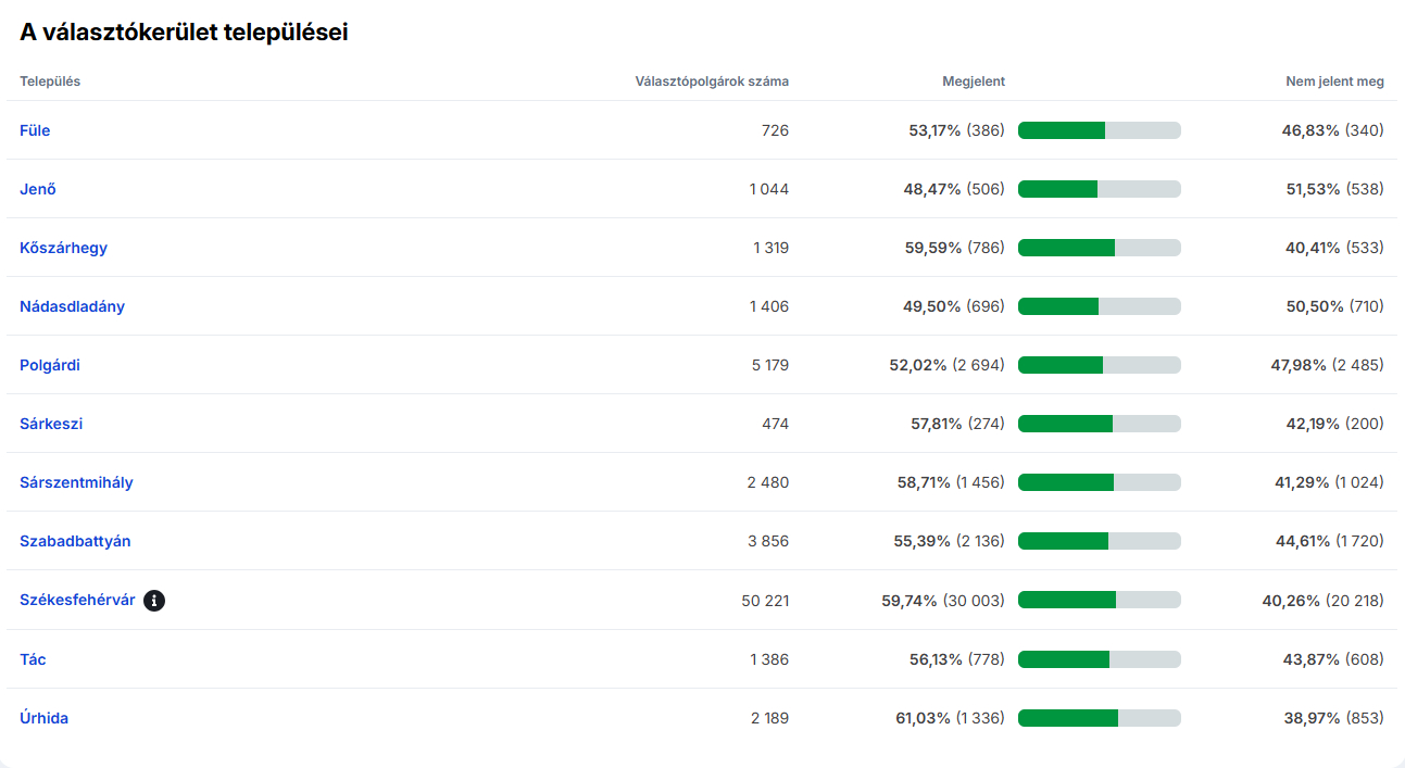 A fehérvári szavazóköröket tekintve kiemelkedő a részvétel a 030. számú szavazókörben – ez a maroshegyi városrészhez tartozik – , amely 67,37%-os mutatójával kiemelkedik a többi közül, de kiváló számokat produkált a 045-ös feketehegyi (65,64%) és a 069-es ráchegyi szavazókör (64,65%) is.
