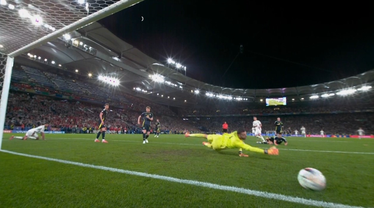 A meccs első 15-20 percében a skótoknál volt leginkább a labda, ők tűntek élesebbnek, frissebbnek, de a kezdeti fölényük nem mutatkozott meg helyzetekben. A mieink szűk félóra után tekertek egyet a fordulatszámon, Bolla átlövését a kapus védte, Szoboszlai első szabadrúgását blokkolta a sorfal, a másodiknál viszont a védők mögé befutó Willi Orban stukkolta a felső lécre az elé löbbölt játékszert, majd volt még egy fölé szálló Szoboszlai löket is, összességében ötször lőttek kapu felé a mi fiaink, míg a skótok tartották nullás átlagukat, ezúttal sem volt kapura tartó lövésük az első félidőt követően.